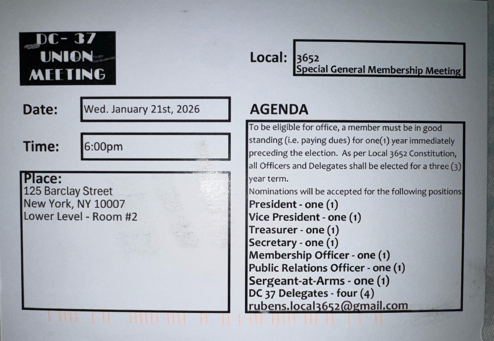 NOTE: You must have your DC37 or AFSCME card to enter the building.