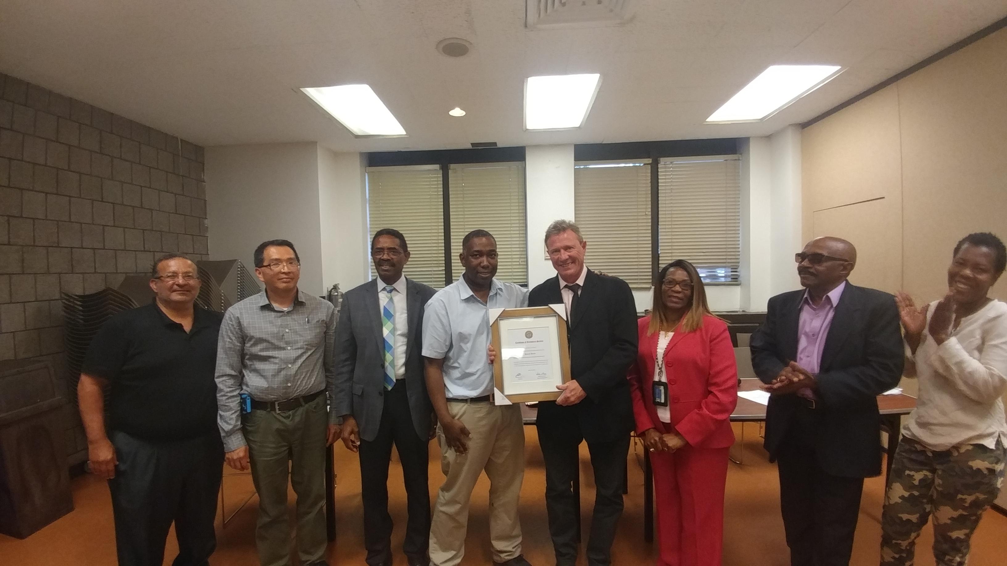 On April 5th, 2019, Patrick Burke of DC 37 Local 3652 went above and beyond the call of duty, while maintaining consistently high standards of professional conduct, to save a customer’s life when he pulled him up from the subway track at the 161st street station. On June 12, 2019, The Local’s executive Board awarded a Certificate of Exemplary Service to Mr. Burke for his heroic action.